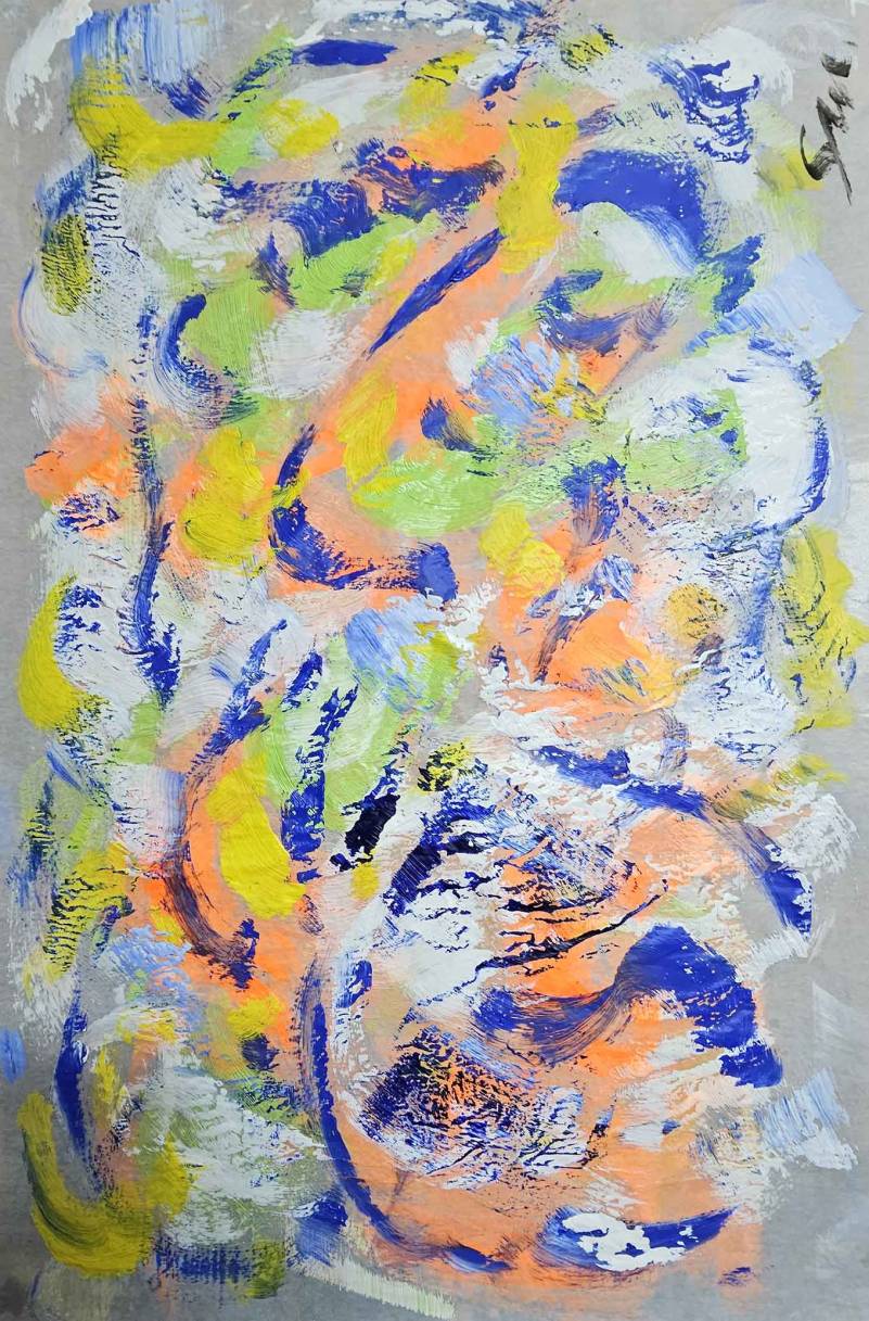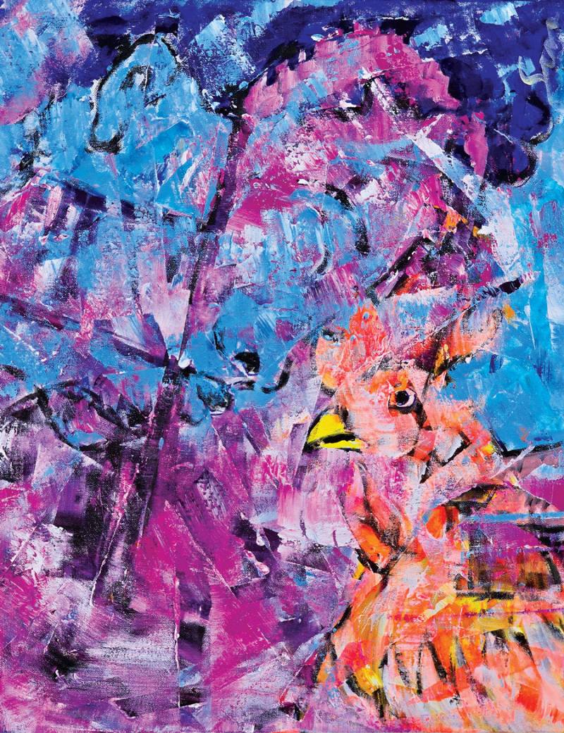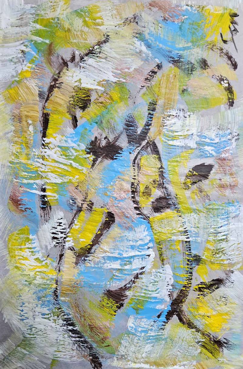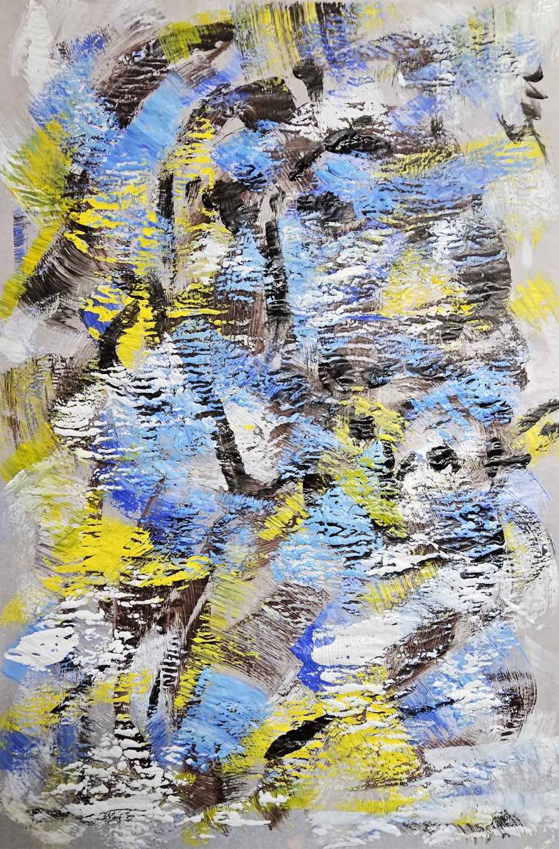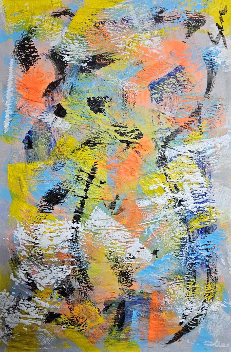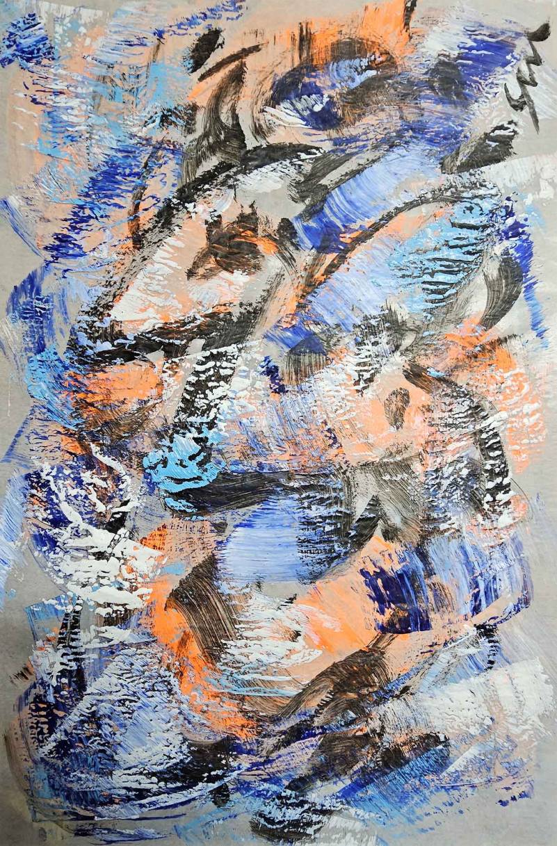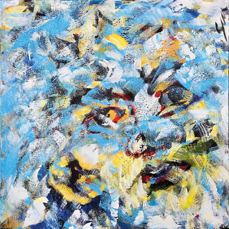 At first glance, we are splashed by the shimmer of his colors. We seek to understand this abstract painting, but very quickly we discover hidden under these scales of colors, figurative representations which challenge us, entangled in other motifs between the real and the imaginary.
