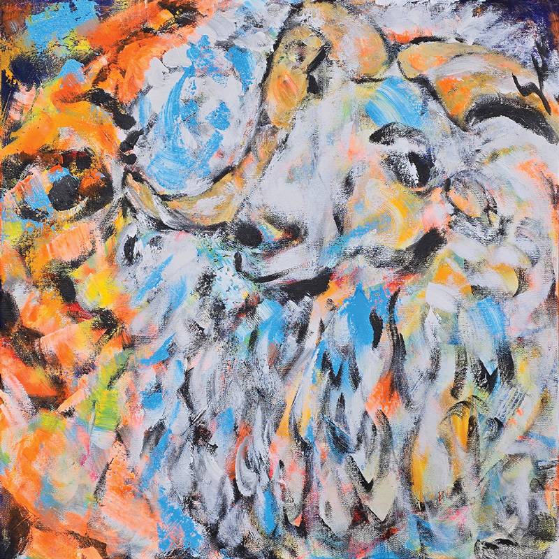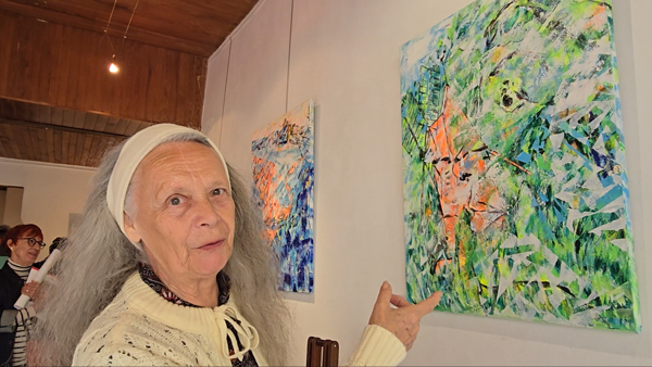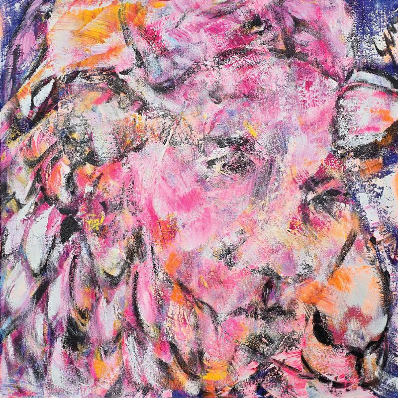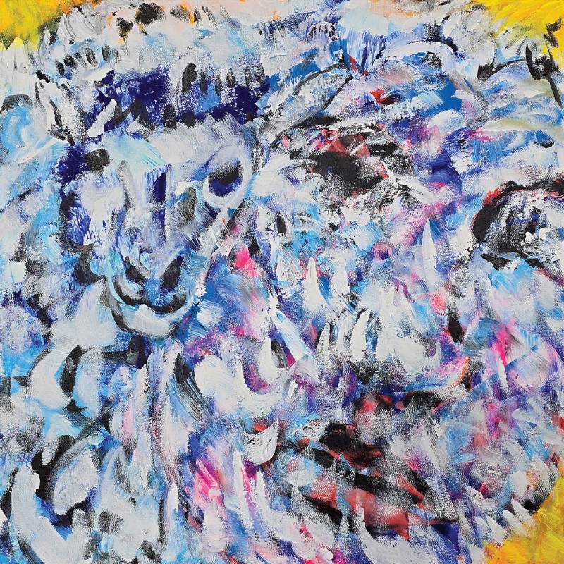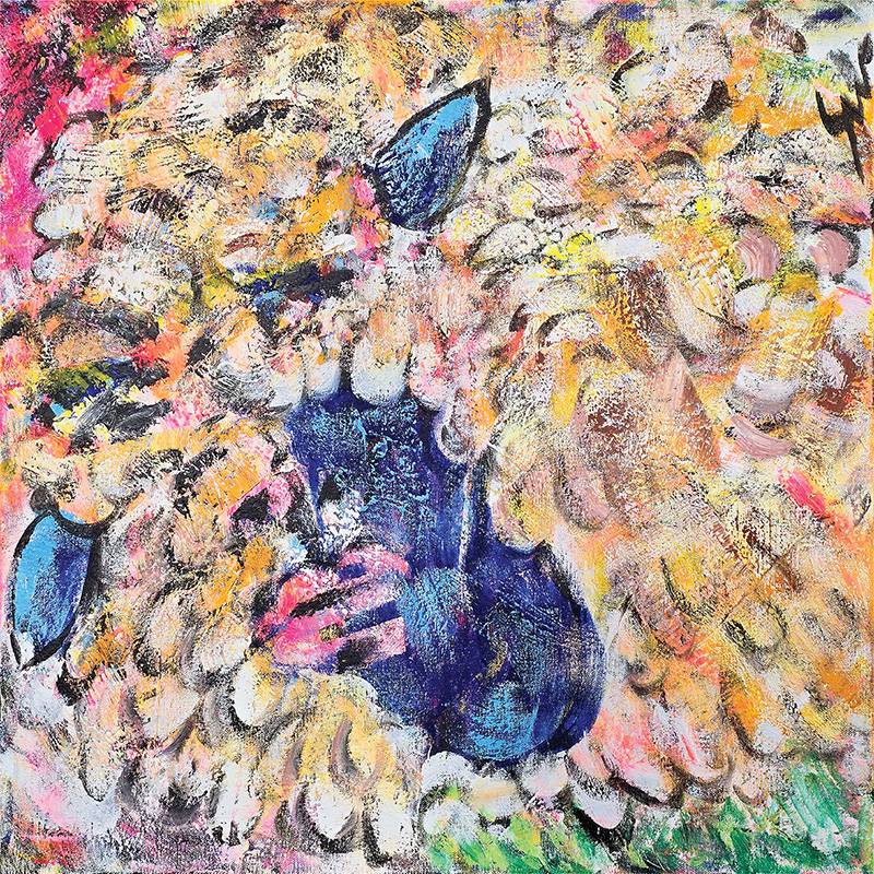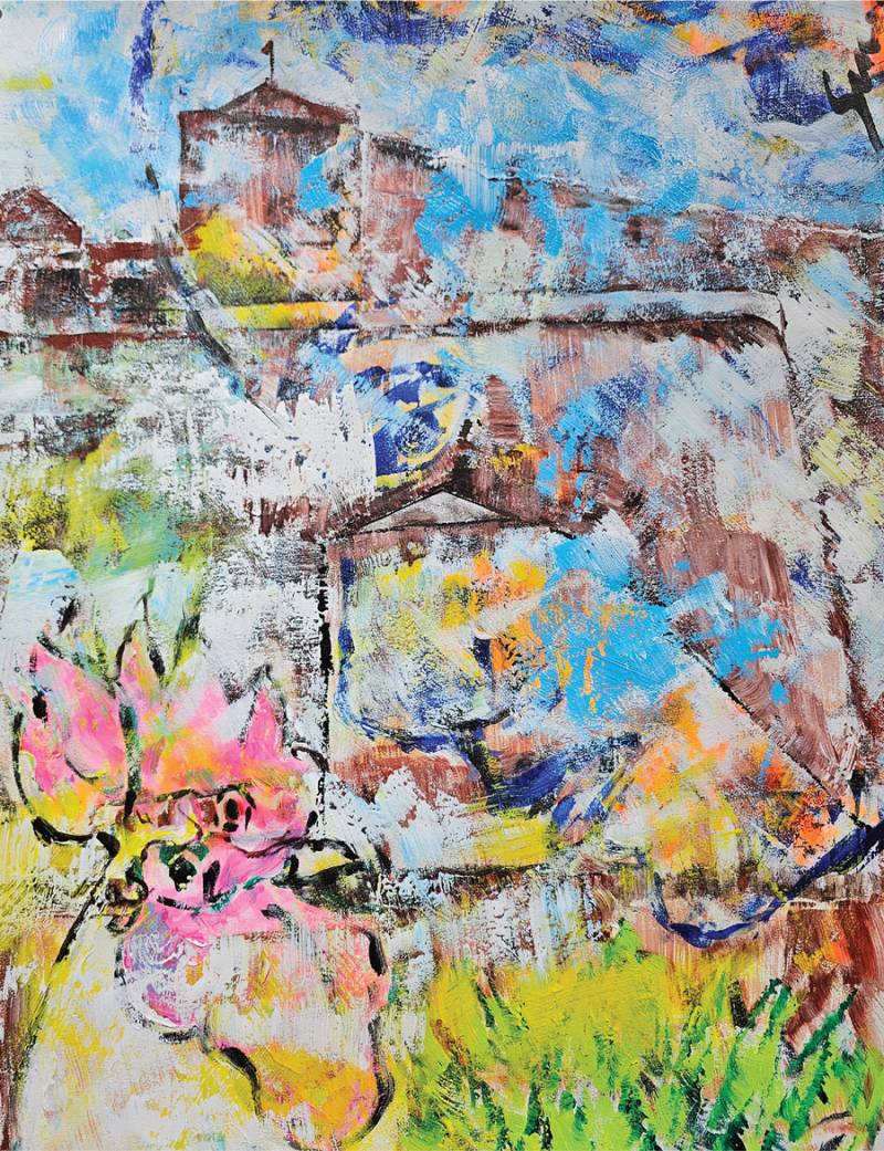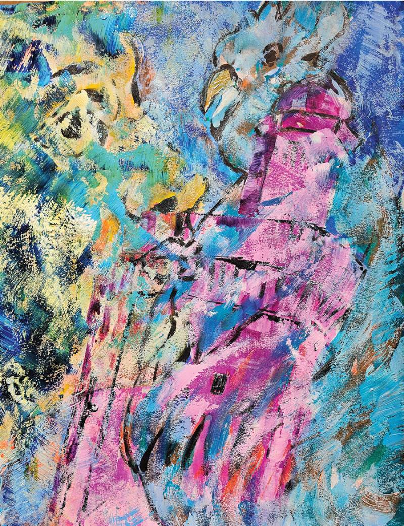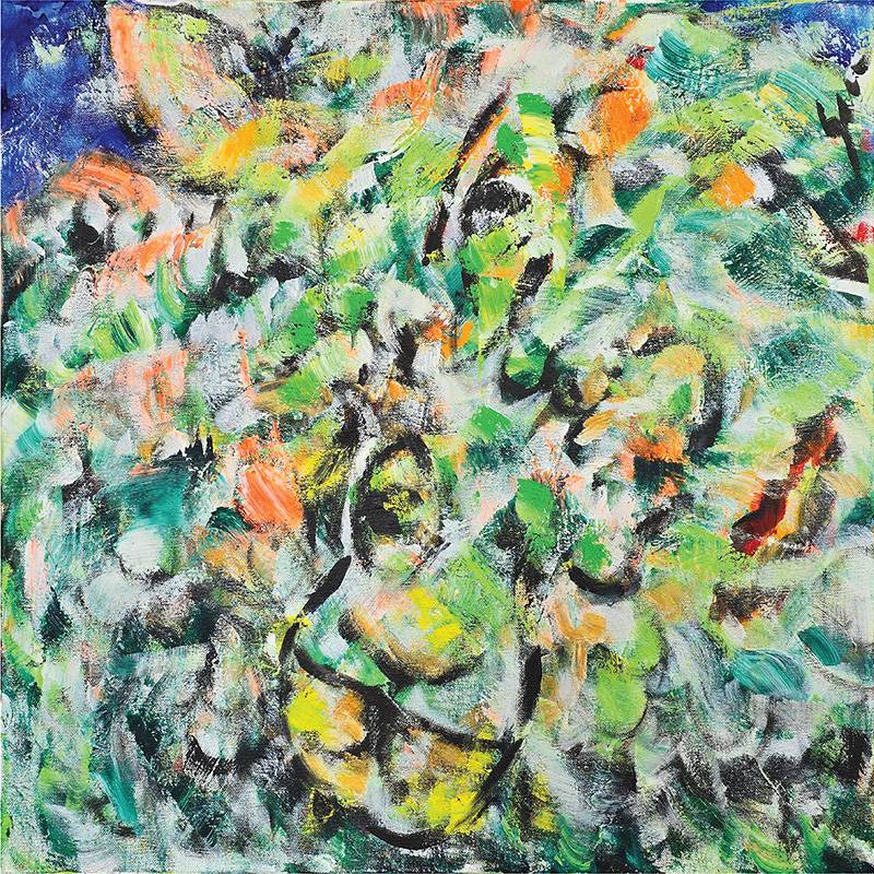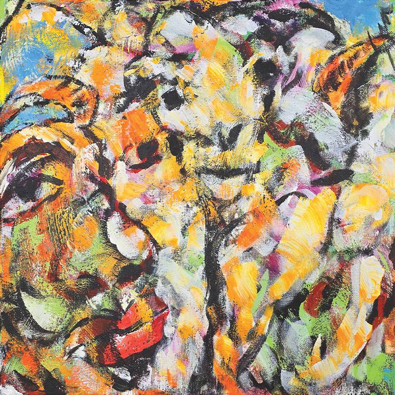 At first glance, we are splashed by the shimmer of his colors. We seek to understand this abstract painting, but very quickly we discover hidden under these scales of colors, figurative representations which challenge us, entangled in other motifs between the real and the imaginary.
