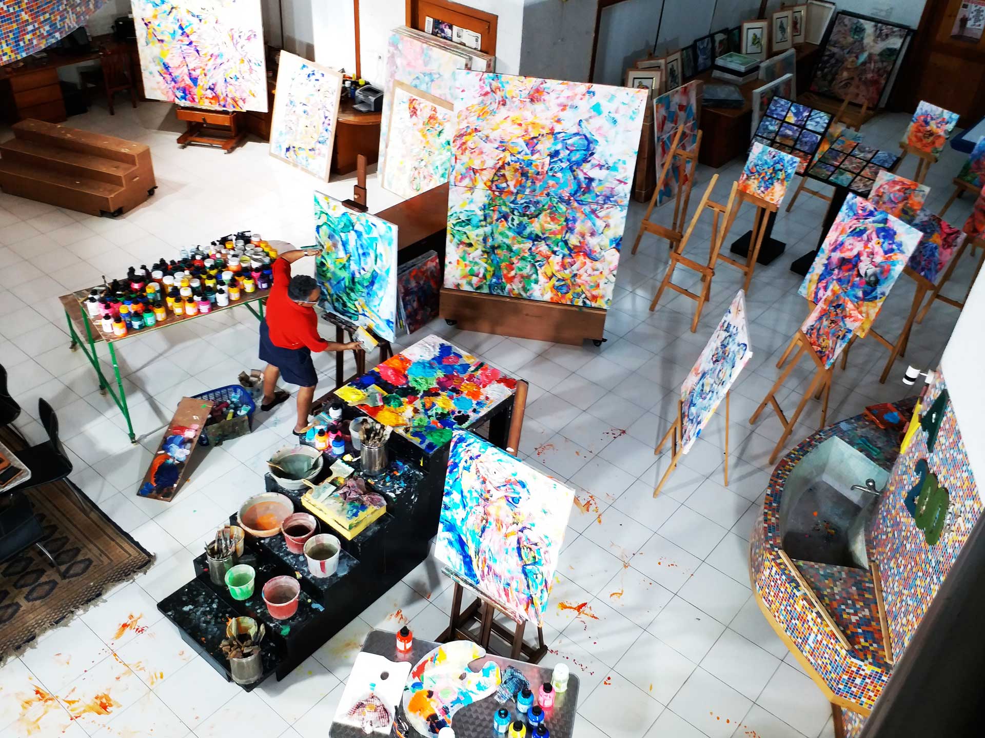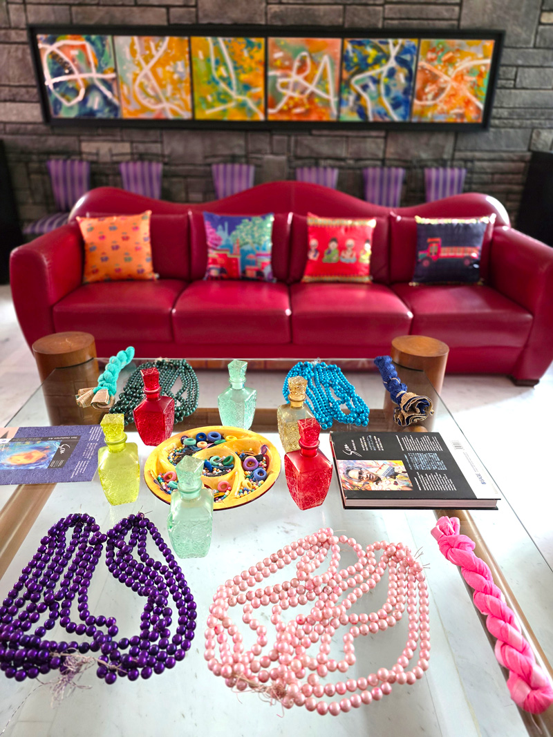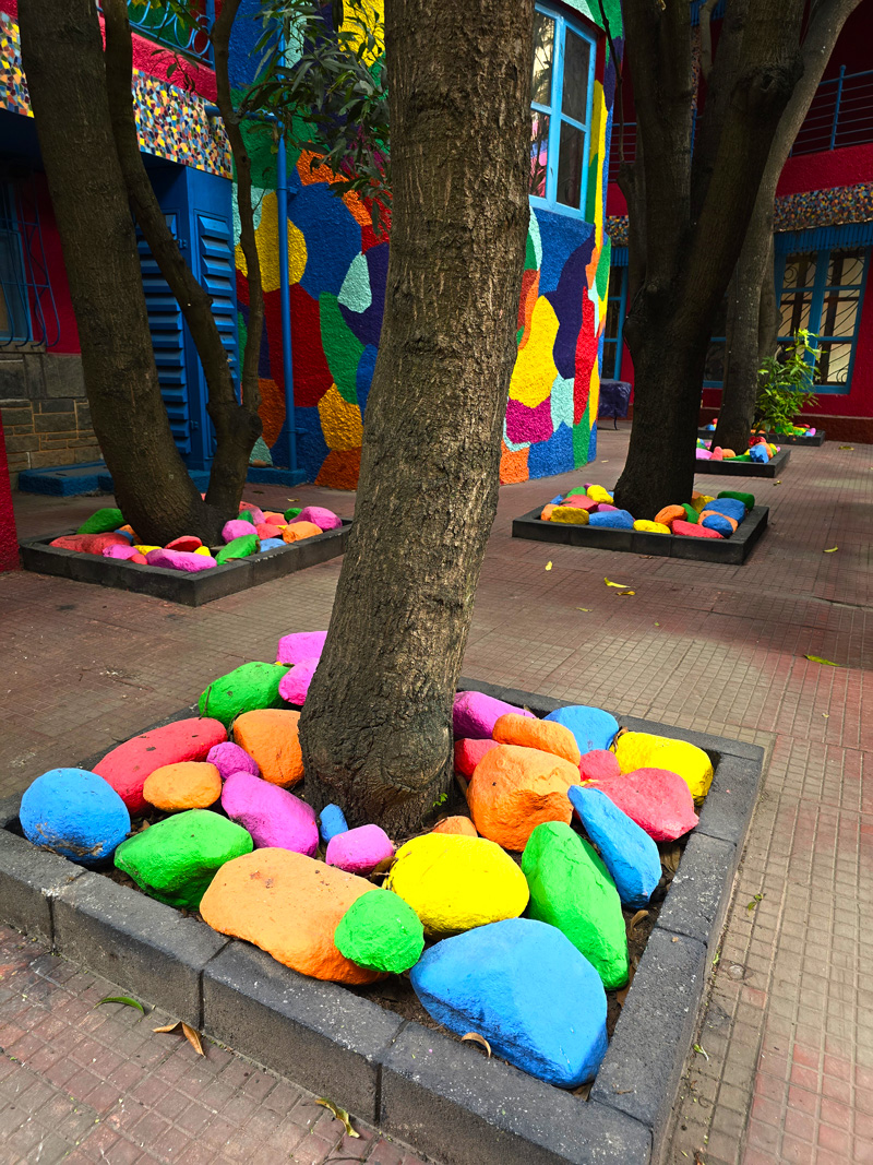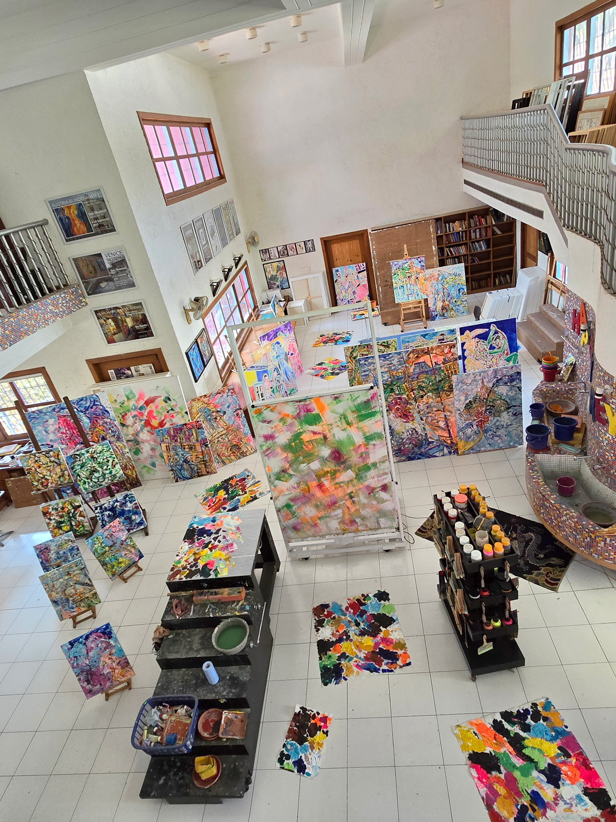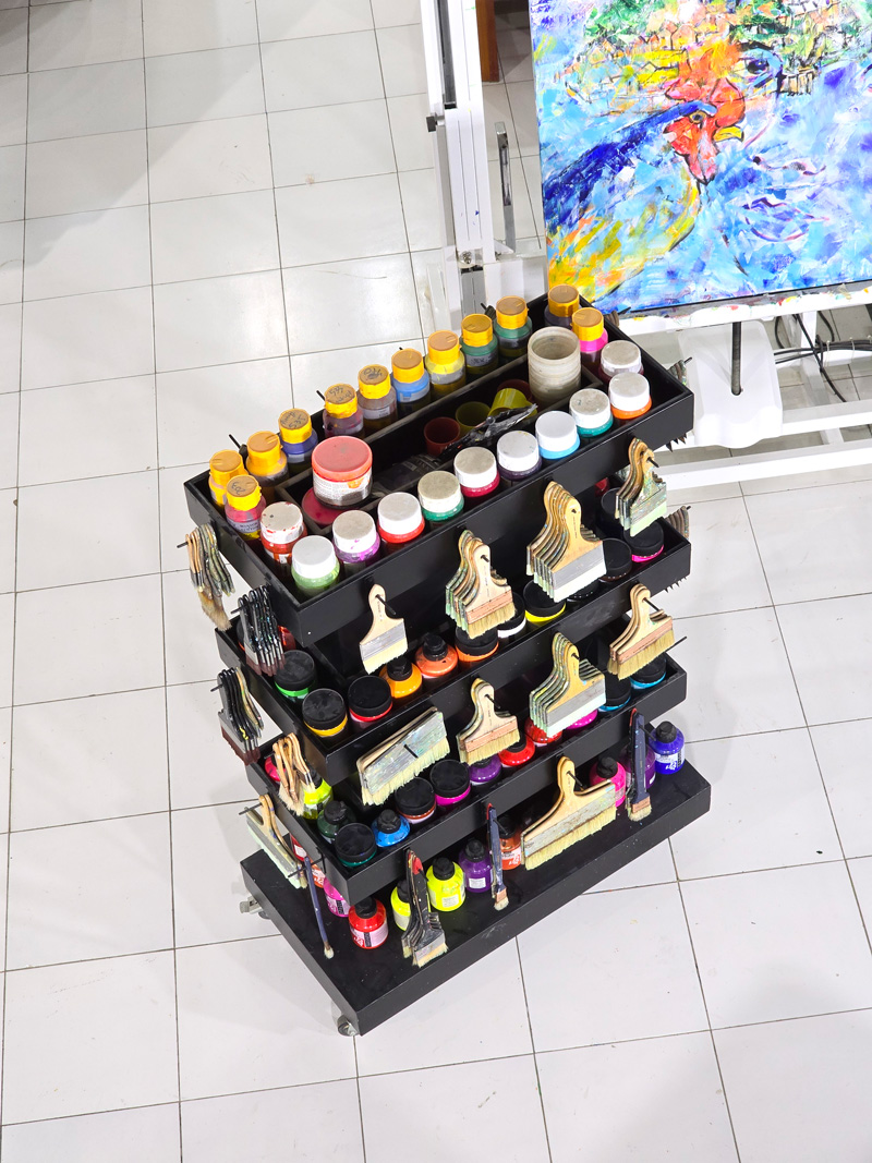 Colour drives my mind. I love to live and paint in this maison atelier of mine, surrounded by nature, colours, the twitter of birds and squirrels. I have filled my home with colourful Indian streetside trinkets. The way I am loyal to vivid colours on my canvas, I indulge my environment too with breathable colours. They play peekaboo with my imagination to boost my paintings of bright abstract colours with hidden figuratives. Here are pictures of my working studio, my working trolley-on-wheels I move around to reach my colours and brushes from one painting easel to the next of the 5 easels I work with. I love the vbrant flowers in my garden, the colourfully painted boulders around the our mango, avocado and coconut tree trunks. I do not differentiate my colour-play from the way I live to the colours I irreverently brush on to my canvas.