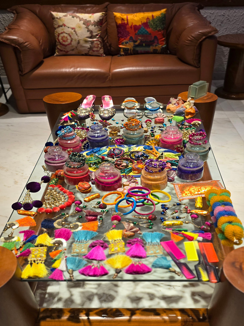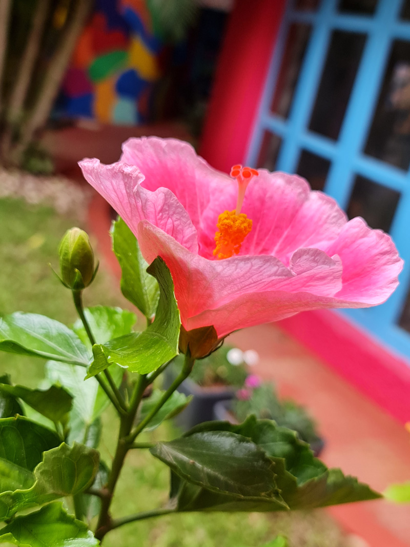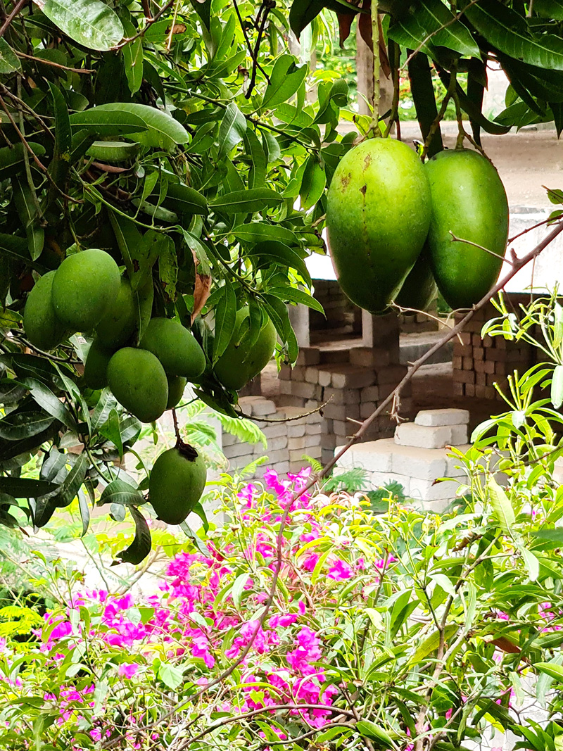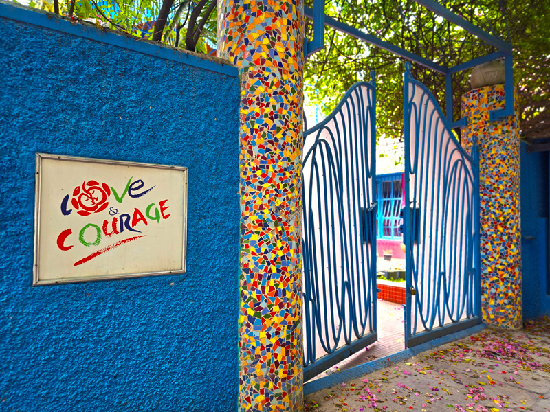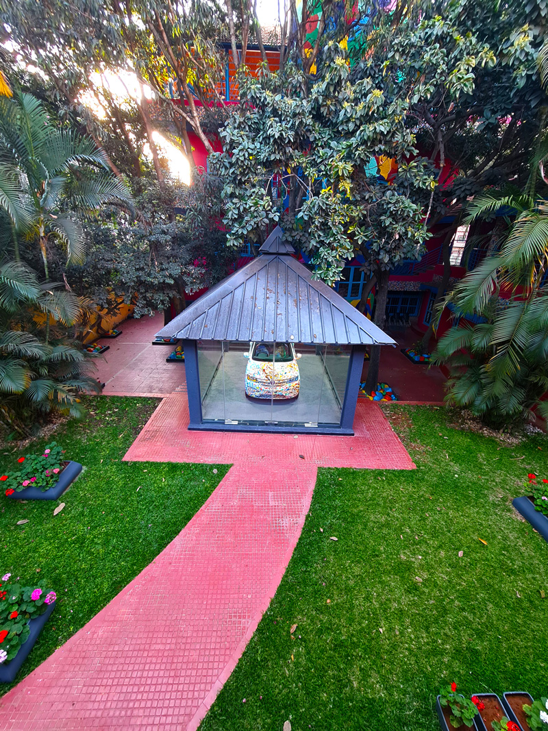 Colour drives my mind. I love to live and paint in this maison atelier of mine, surrounded by nature, colours, the twitter of birds and squirrels. I have filled my home with colourful Indian streetside trinkets. The way I am loyal to vivid colours on my canvas, I indulge my environment too with breathable colours. They play peekaboo with my imagination to boost my paintings of bright abstract colours with hidden figuratives. Here are pictures of my working studio, my working trolley-on-wheels I move around to reach my colours and brushes from one painting easel to the next of the 5 easels I work with. I love the vbrant flowers in my garden, the colourfully painted boulders around the our mango, avocado and coconut tree trunks. I do not differentiate my colour-play from the way I live to the colours I irreverently brush on to my canvas.