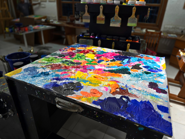 I am extremely meticulous that my canvas is stretched with wedges in a high-quality wooden chassis. At the end of each work day, I leave my studio extremely clean. Cleanliness was my mother’s training during our refugee camp life. She used to say, “You must always be clean in any situation of life. Dirtiness can never give you fresh ideas.” I need to see my next day in a completely fresh way, with newness for new ideas. I thoroughly clean my brushes myself and still use my 40-year-old brushes. The way a chef loves his old utensils, I too love my old brushes. My brush contact brings on a seasoning factor to my way of working which I can never replace.